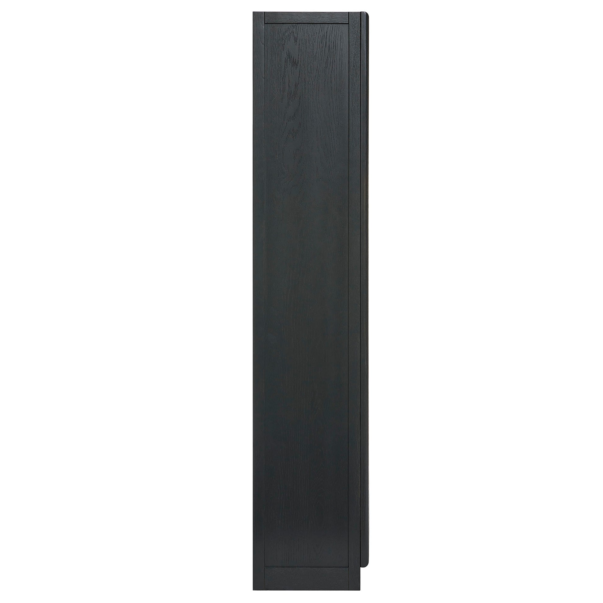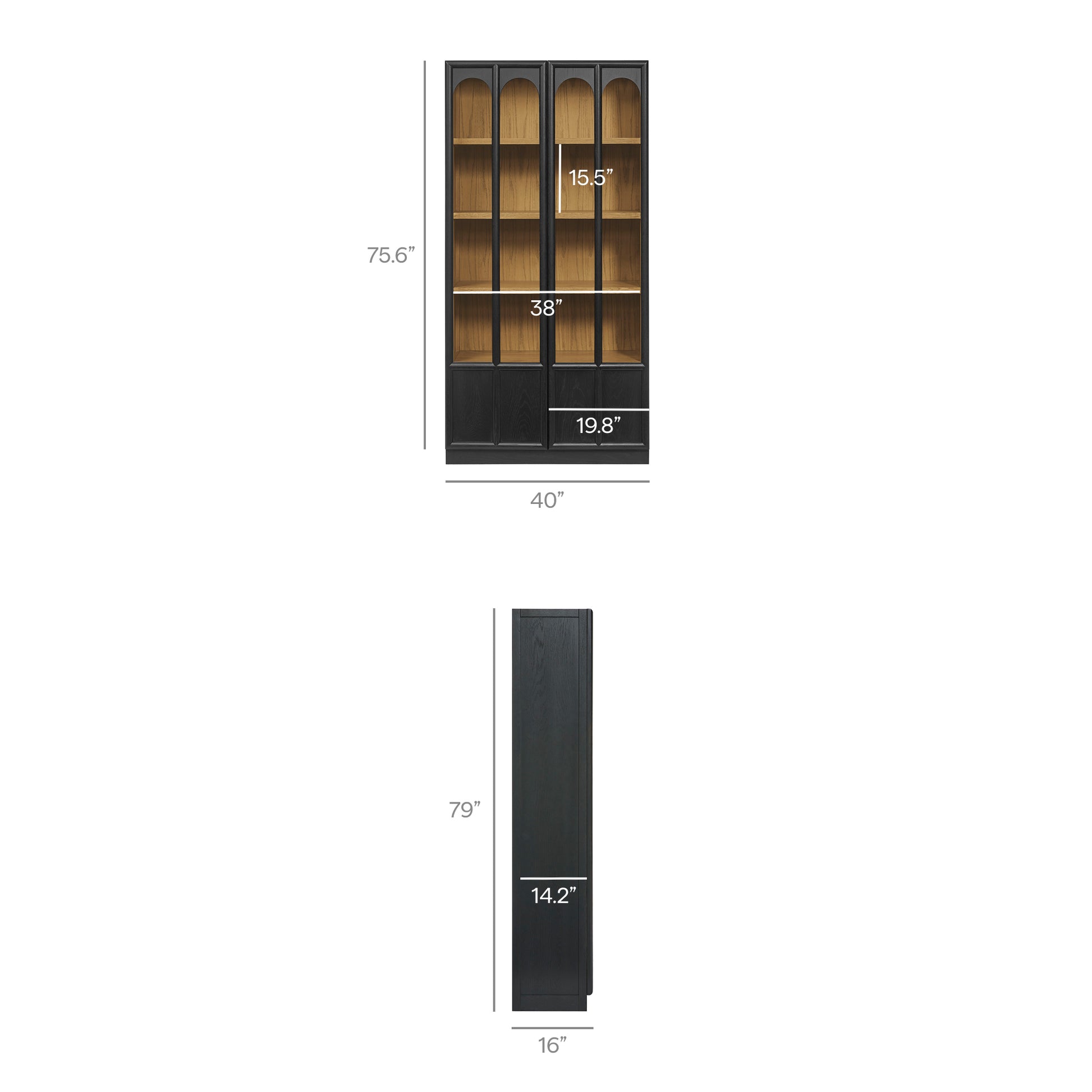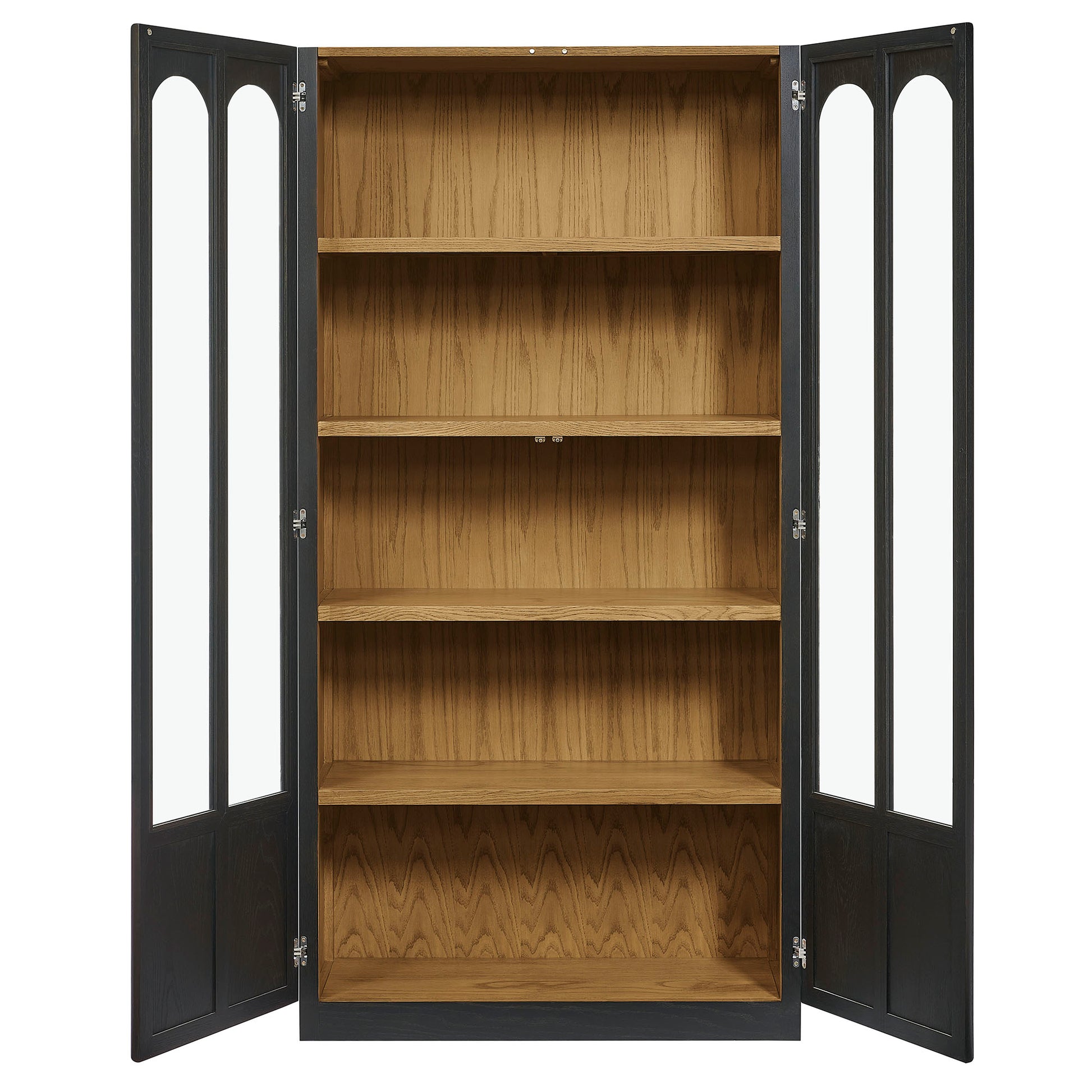 The Anwen Display Cabinet brings refined craftsmanship and modern elegance to living rooms, dining rooms, home libraries, and more. At 79" tall, this solid wood storage cabinet with glass doors and shelves showcases a sophisticated arched design across its front tempered glass panels, creating a timeless focal point for any interior. Constructed from solid, kiln-dried oak, acacia, and oak wood veneer, the Anwen tall wood curio cabinet features premium joinery, tempered glass doors, and soft-close precision with a push-to-open magnetic catch. Inside, four fixed shelves provide generous storage and display space for collectibles, dinnerware, books, or décor, while the concealed bottom shelf offers a clean, streamlined finish. Blending the function of a china cabinet, curio cabinet, and tall bookcase with glass doors, this contemporary display cabinet elevates both form and utility. Arrives fully assembled.- Tall Display Cabinet with Glass Doors