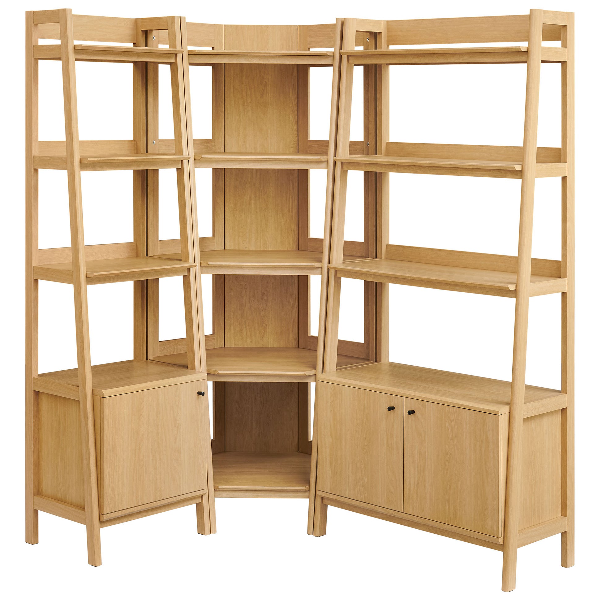 Stack your favorite reads and display décor with this wider 3-piece Bixby corner bookcase set. Designed to nest neatly into a corner, the set offers twelve total tiers, combining open shelves with lower cabinets on each side for hidden storage. Laminated wood grain and clean, open lines keep the look balanced and modern, while angled side supports and window-style panels lighten the profile and add stability. Built from a durable wood blend for long-lasting use, the Bixby wide bookcase set serves as a prominent 88 inch wide wall display. Weight Capacity: 141 lbs per shelf.- Corner Design